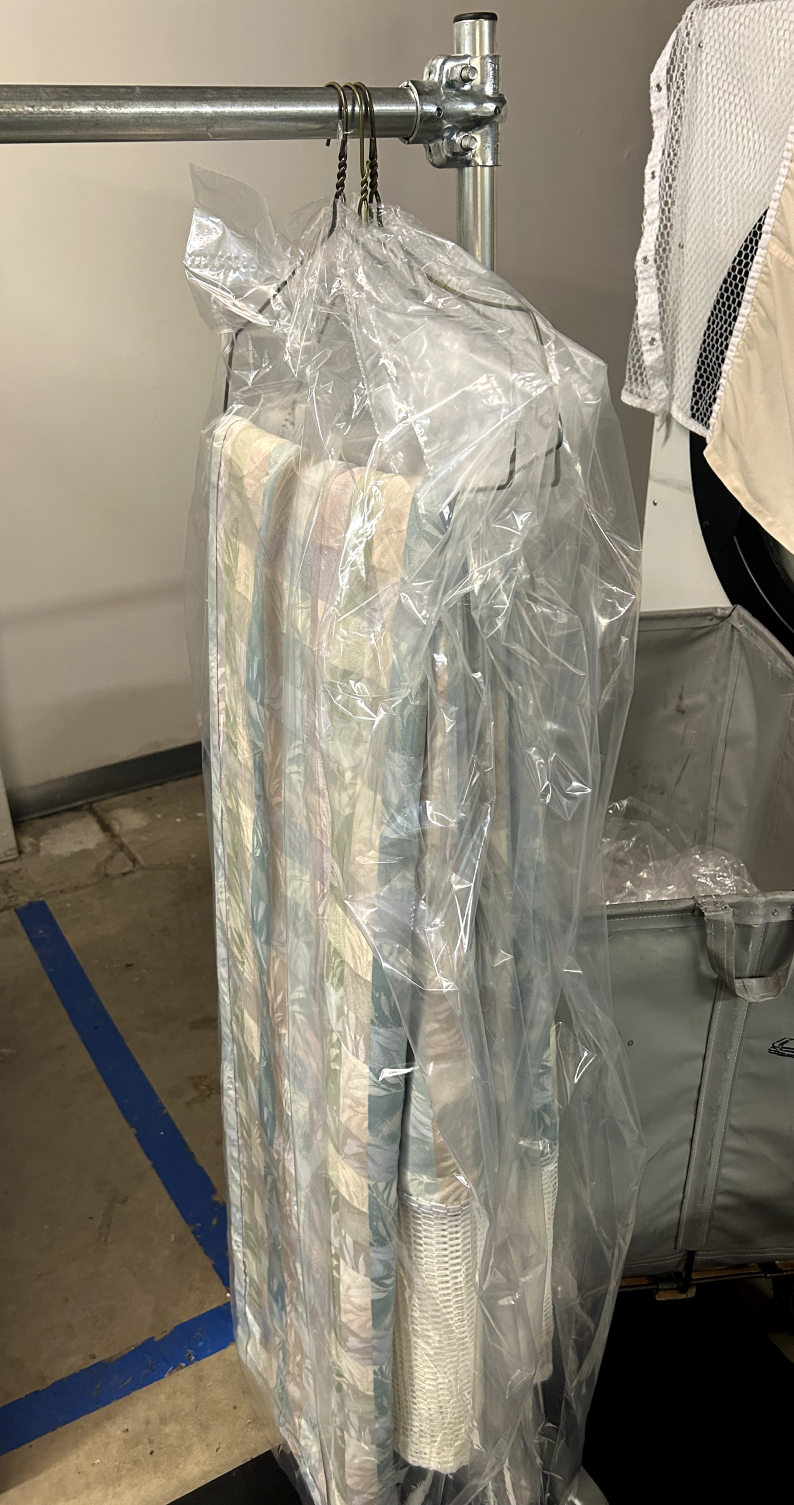 Just schedule with us when you want our team to pick up your dirty curtains once they have been taken down by your staff and we ensure a prompt pick up. Once we have curtains back to our facility, we use our comprehensive laundering system to wash, dry, and iron your curtains. We then protect your curtains further with plastic wrapping that guarantees your curtains don’t get contaminated. Finally, we return and hang your curtains to your designated laundry room.
